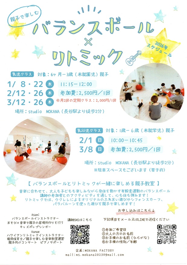 | 活動内容 | ハワイアンの音楽に合わせて、歌う、踊る、リズム遊び、表現あそびなど様々な要素を取り入れたハワイアンリトミッククラスやバランスボールとリトミックが一緒に楽しめる親子教室を行っています。 音楽に合わせて、大人も子どもも楽しみながら思いっきり身体を動かして一緒に遊びましょう!ウクレレによるオリジナルのふれあい遊びやシフォンスカーフやパラバルーンを使った遊びもいっぱい!遊びにきてね。 ![]() |